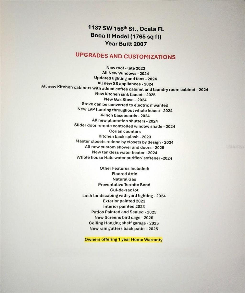 SUMMERGLEN GOLF COURSE COMMUNITY Lot 535. THIS HOME IS A MUST SEE! As soon as you walk in the front door it is a light and bright home and you just feel like you are in Florida! Before reading any further you need to read the attached UPGRADES and CUSTOMIZATIONS sheet. Or find it amongst the pictures. Too much to enter here. Here are a few of the upgrades: NEW ROOF-late 2023, ALL NEW WINDOWS-2024, Updated LIGHTING AND FANS-2024, ALL NEW SS APPLIANCES-2024, ALL NEW KITCHEN CABINETS with added coffee cabinet and laundry room cabinet-2024, NEW LVP FLOORING-2024, 4-inch baseboards-2024, ALL NEW PLANTATIONS SHUTTERS-2024, Master closets redone by closets by design-2024, All new custom shower and doors-2025, NEW TANKLESS WATER HEATER-2024, Whole house Halo water purifier/softener-2024. The list of charm and character that has been added to this home could go on and on, but it just needs to be seen and experienced in person to take it all in. The OWNERS have gone way above and beyond with upgrades and this home is priced to sell. Not only is this home beautifully kept and updated, but the community of SummerGlen is full of every activity possible. SUMMERGLEN is located Minutes from I-75 and The Florida Horse Park, close to The Villages, and the Town Squares, while still feeling like it is secluded and private. SUMMERGLEN Has a 18 Hole Golf Course and Golf Shop. HOA fee includes mowing/edging of yard, garbage pickup including recycling, Spectrum Bronze Tier 1 TV and 100 Mbps internet, as well as access to all amenities. Did I mention ALL of the community amenities? All this and more located in an active, gated community featuring club house with lounge area, space for future restaurant and meeting rooms, tons of activities & 70 clubs plus bocce ball, pickleball, tennis courts, softball, heated pool & spa, RV parking, dog parks, and tons more! All of that along with a $30 food and beverage Credit to be used at the new Community Restaurant, Tavern at the Glen. Owners are offering a 1 year home warranty for buyer's peace of mind.