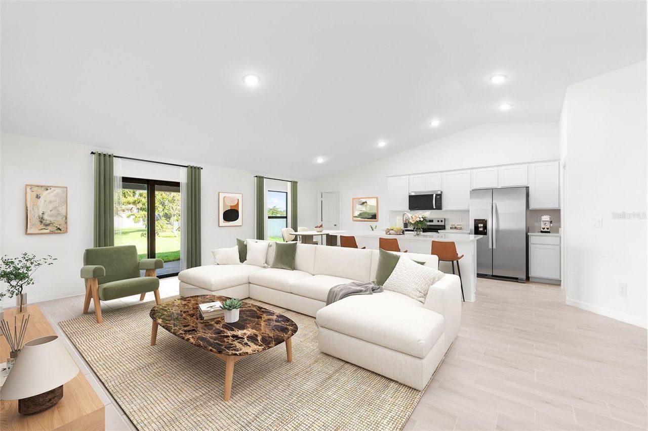 One or more photo(s) has been virtually staged. Under Construction. NEW CONSTRUCTION WITH WARRANTY! *Estimated delivery August 2026. The Cayo Costa combines open-concept living with a smart split-bedroom layout, offering three bedrooms plus a den and two bathrooms. Perfectly designed for entertaining, the main living area showcases a soaring vaulted ceiling that seamlessly connects the kitchen, dining area, and expansive Great Room. A large freestanding island provides the ideal centerpiece for both casual meals and social gatherings, while sliding glass doors extend the living space to a covered lanai for effortless indoor-outdoor living. The private Primary Suite is a true retreat, featuring two spacious walk-in closets and a well-appointed en-suite bathroom. On the opposite side of the home, two comfortable guest bedrooms share a full bath, ensuring both privacy and convenience. A versatile den with French doors offers the perfect space for a home office, study, or creative flex room. Highlights of the Cayo Costa include: Quartz countertops in kitchen and baths, designer cabinetry with soft-close doors, stainless steel kitchen appliance package, upgraded plank tile flooring in main living areas, hurricane-impact windows and doors, attached 2-car garage with direct laundry access, and more! Pictures, renderings, & virtual tour are of similar home & are used for display purposes only.
